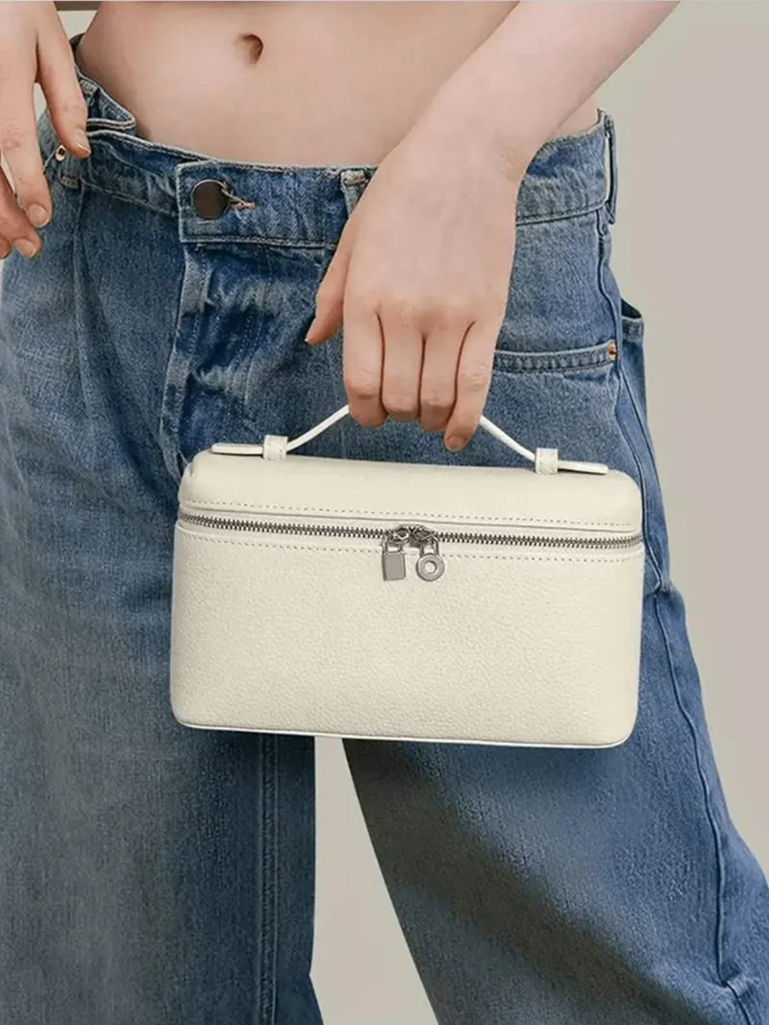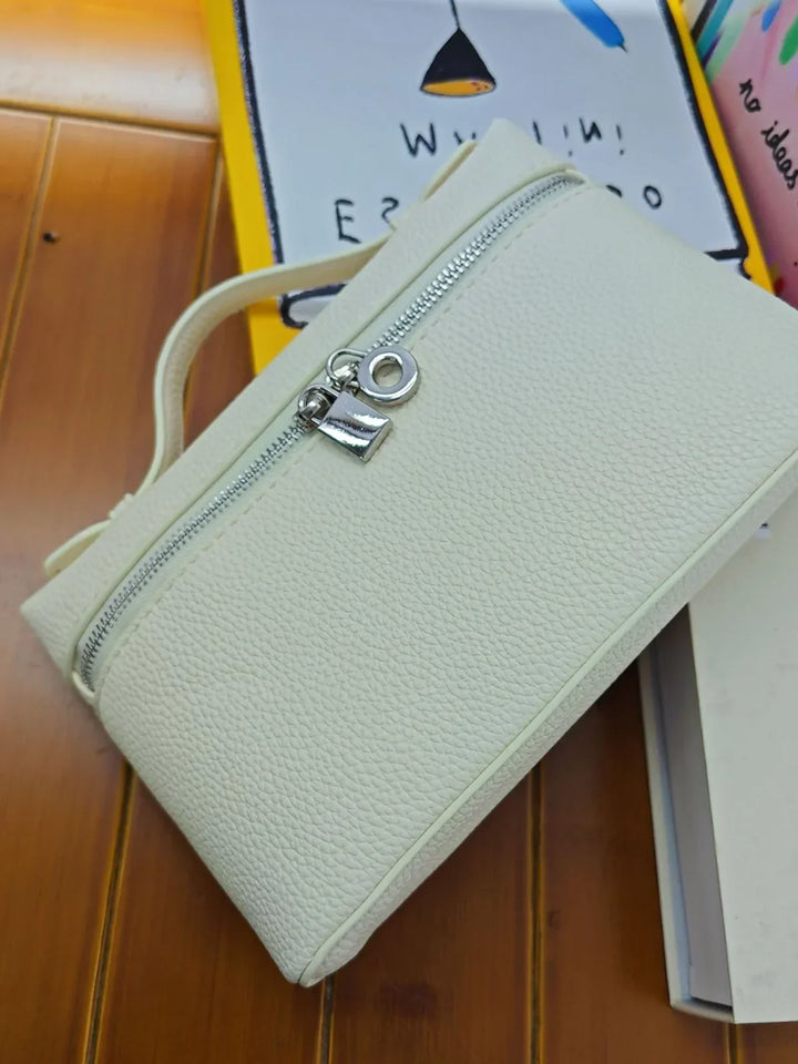 This elegant vanity bag features a sleek, minimalist design with a secure silver-tone zipper and structured handle. Compact yet spacious, it’s perfect for organizing essentials while adding a refined touch to your look.