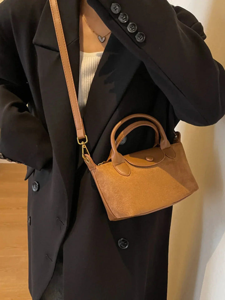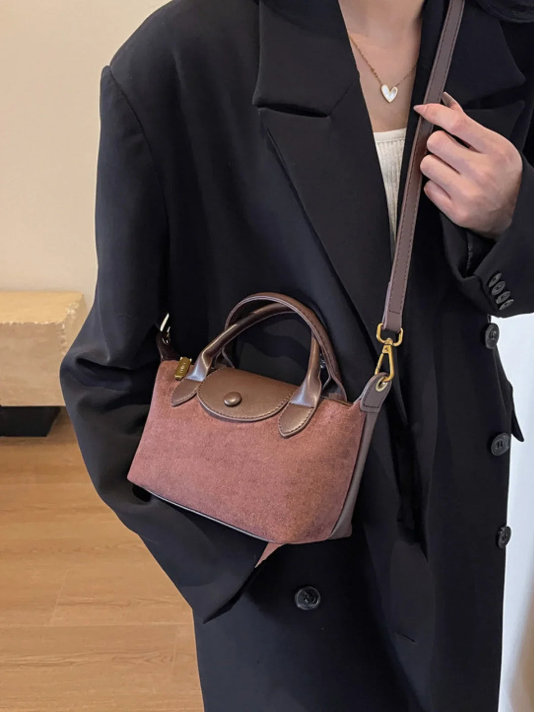 This chic mini satchel bag features a soft faux suede body with elegant faux leather accents, creating a stylish yet compact design. The buttoned flap closure and sturdy top handle add a classic touch, while the detachable shoulder strap allows for versatile wear as a crossbody or handbag.
